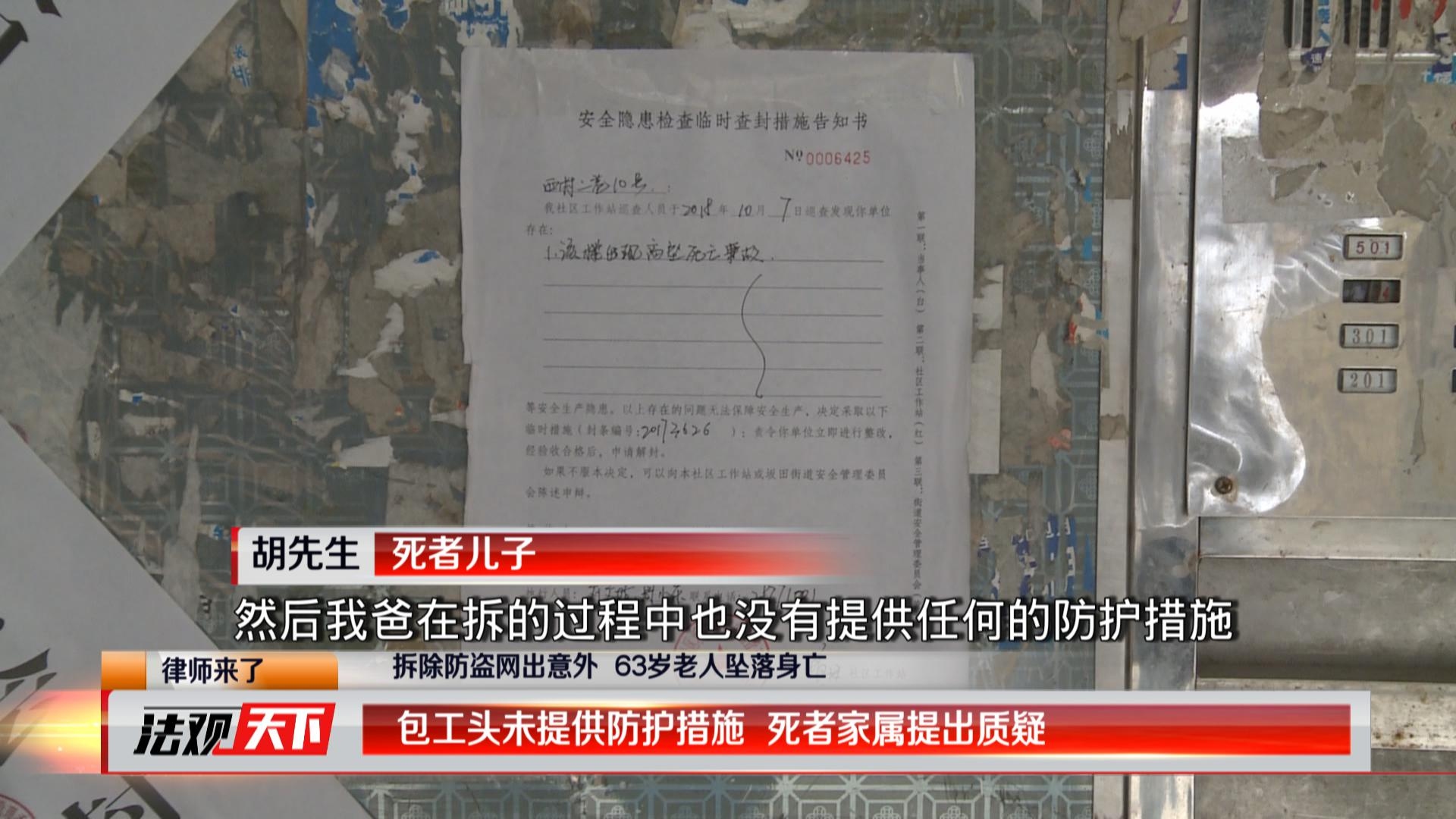 可是在這次事件中,63歲的死者老胡明顯是無(wú)證且年齡超標(biāo),在高空作業(yè)時(shí),也沒(méi)有相應(yīng)的防護(hù)措施。死者家屬說(shuō),事發(fā)后,無(wú)論是包工頭還是房東都沒(méi)有出面承擔(dān)相應(yīng)的責(zé)任。