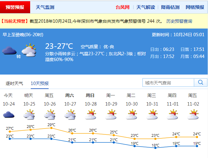 今日,鵬城以多云天氣為主,仍有分散小雨。早晚天氣較涼,最低氣溫在23℃左右,白天最高氣溫升至27℃左右。風力和緩,市區(qū)內維持2-3級的平均風力,沿海地區(qū)平均風力3-4級,最大陣風達到6級。相對濕度適中,最小相對濕度為60%,最大濕度90%。
