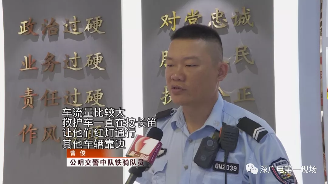 在場的四名鐵騎隊(duì)員立即進(jìn)行分工,在救護(hù)車被堵的紅綠燈口,其中一名鐵騎,曾俊首先對救護(hù)車前方等待紅燈的車輛進(jìn)行疏導(dǎo)。