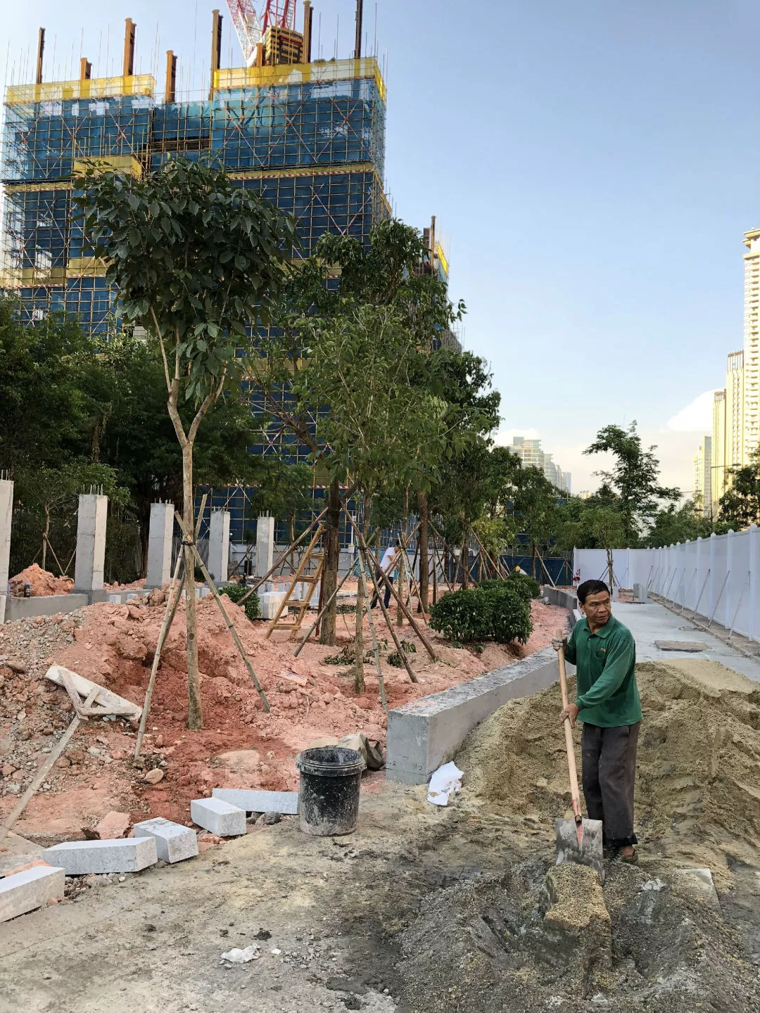▲街心公園施工中昨日下午,記者先后來到三個(gè)正在建設(shè)的街心公園走訪,大鏟社區(qū)街心公園、東角頭地鐵站A/B廣場(街心公園)剛剛動(dòng)工,而后海濱路街心公園雛形初顯,公園路面已經(jīng)修好,工人正在種植喬木。