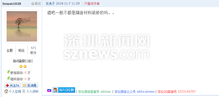 深圳新聞網11月7日訊(記者 施冰冰)11月6日,有網友在論壇爆料稱民治藍坤大廈米蘭國際酒吧每晚營業(yè)至凌晨4點,音樂聲震耳欲聾,嚴重影響了附近居民的睡眠,“逼得”該網友只能搬家。(網帖地址:https://szbbs.sznews.com/thread-3815241-1-1.html