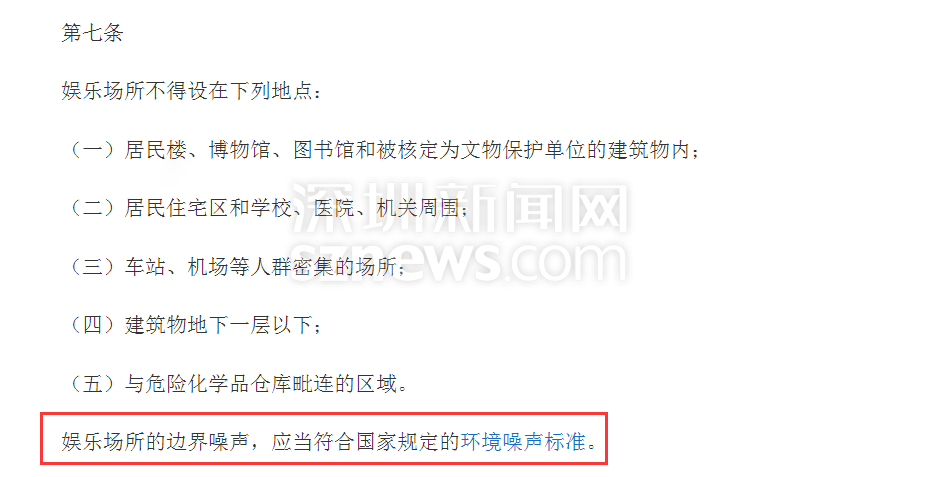 此外,該管理條例還對娛樂場所的邊界噪聲做出了明確規(guī)定,要求其邊界噪聲應當符合國家規(guī)定的環(huán)境噪聲標準,即睡眠30分貝。
