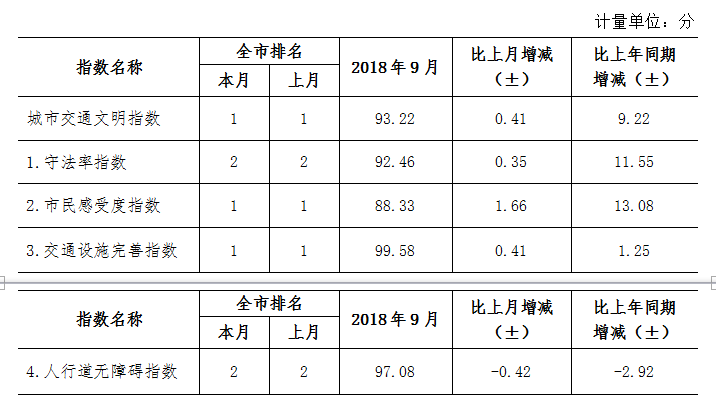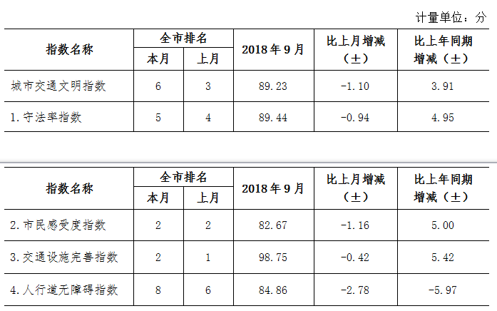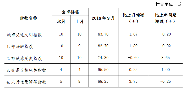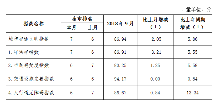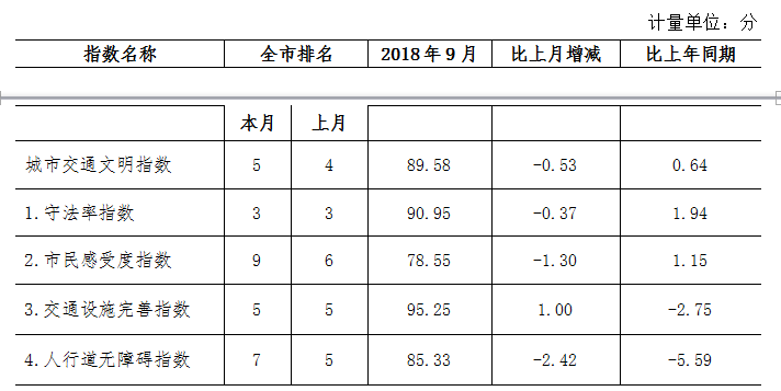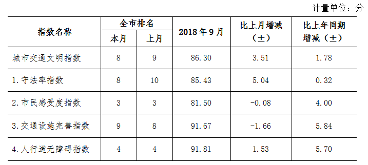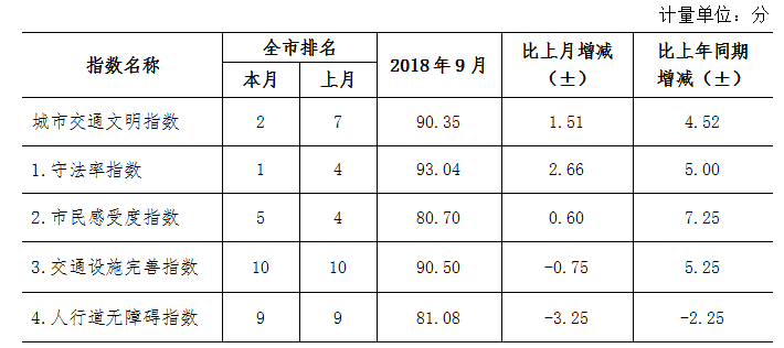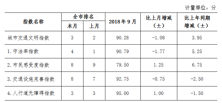 9月份深圳市城市交通文明指數(shù)為87.02分。與上月對(duì)比,四項(xiàng)分項(xiàng)指數(shù)呈“三升一降”現(xiàn)象。