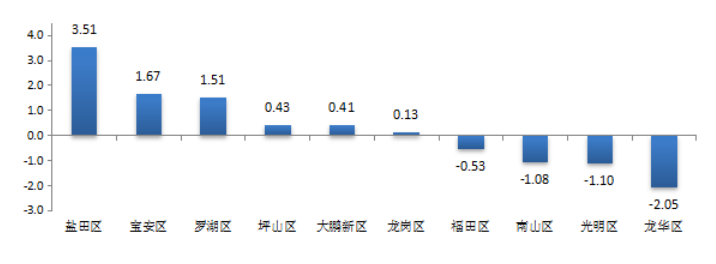與上月對(duì)比,各區(qū)(新區(qū))城市交通文明指數(shù)呈現(xiàn)“六升四降”局面。羅湖區(qū)、鹽田區(qū)、寶安區(qū)、龍崗區(qū)、坪山區(qū)和大鵬新區(qū)得分有所上升,其中鹽田區(qū)上升幅度較大,增加3.51分;福田區(qū)、南山區(qū)、光明區(qū)和龍華區(qū)得分均有不同程度下降,其中龍華區(qū)下降幅度最大,減少2.05分,其次是光明區(qū)和南山區(qū),分別減少1.10分和1.08分(見圖3)。