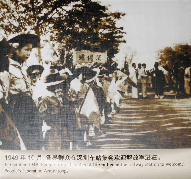 圖為居民在車站歡迎解放軍,背后可清晰地看到當(dāng)時深圳火車站的站名“深圳墟”