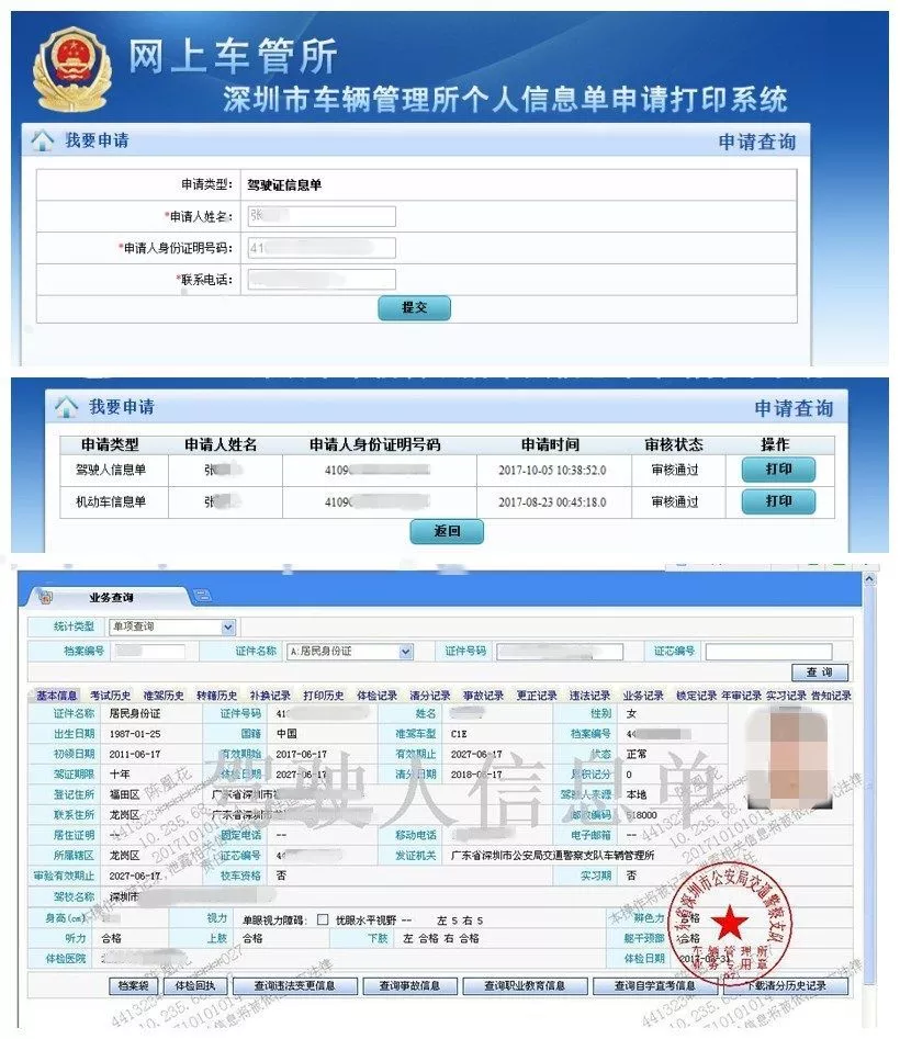 ②登入網(wǎng)上深圳交警 →網(wǎng)上車管所 →駕駛證業(yè)務(wù) →在線申請(qǐng) →駕駛證信息單查詢及打印、駕駛?cè)税踩鹿市庞帽聿樵兗按蛴?/p>