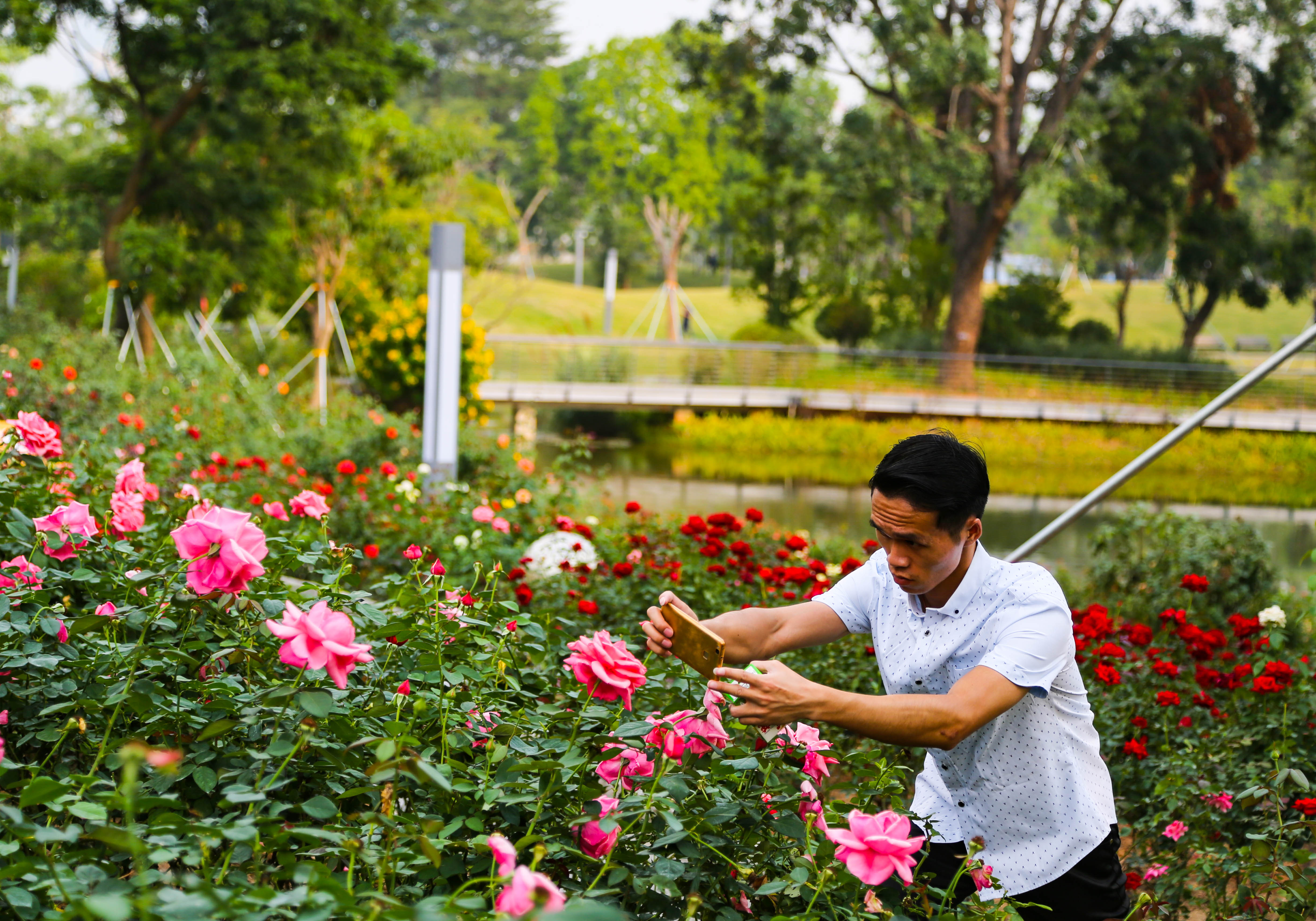 在婚姻登記處和禮堂的北側(cè)是一大片的玫瑰花海,最近天氣晴好,正是鮮花怒放的時(shí)候,不少市民在在參觀完裝修中的禮堂之后,選擇在花海里自拍,一位市民甚至把落下的花瓣拾起,裝了滿滿兩袋,用花瓣在地上擺成“智慧”等漢字字樣。