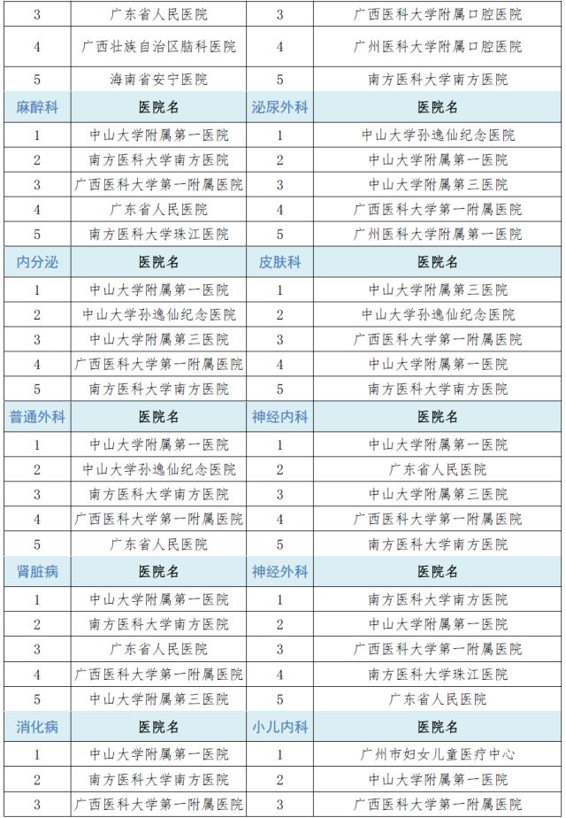 此外,廣東進(jìn)入全國專科前十名的其他??朴?中山三院的風(fēng)濕科;廣州市精神衛(wèi)生中心(廣州惠愛醫(yī)院)的精神醫(yī)學(xué);中山大學(xué)光華口腔醫(yī)院的口腔科;中山大學(xué)孫逸仙紀(jì)念醫(yī)院的泌尿外科、內(nèi)分泌科;廣州市婦兒中心的小兒外科;廣州醫(yī)科大學(xué)附屬第一醫(yī)院的胸外科;中山大學(xué)附屬腫瘤醫(yī)院的胸外科與腫瘤學(xué)。