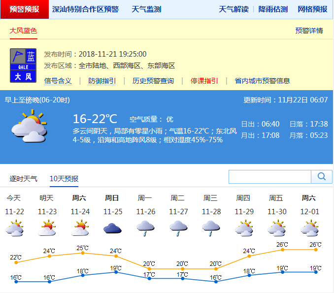據(jù)氣象測報,20日夜間到21日白天,深圳多云,局地有零星小雨,早晨最低氣溫21-23℃,白天最高氣溫27-29℃。但從21日夜間開始,深圳受冷空氣影響,陰天有分散小雨,沿海和高地陣風(fēng)7-8級,天氣顯著轉(zhuǎn)涼;22日午后風(fēng)力逐漸減弱,轉(zhuǎn)多云;23-24日,以晴天到多云天氣為主,可見陽光,早晚清涼;25日云量增多,偶有分散小雨;26-28日受冷空氣補充影響,陰天有小雨。