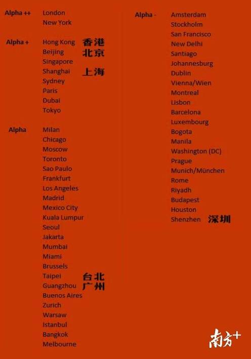 其它的中國城市,香港、北京、上海位于第二檔Alpha+級,分別位于全球3、4、6位,該級共有8個城市;臺北、廣州位于第三檔Alpha級,分別位于全球26、27位,該級共有23個城市。