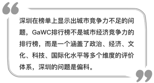 從GaWC發(fā)布的榜單和評價(jià)體系可以看出,深圳雖然在經(jīng)濟(jì)實(shí)力和經(jīng)濟(jì)總量上已經(jīng)取得了較大發(fā)展,但城市國際綜合競爭力尤其是城市軟實(shí)力還存在明顯差距,“偏科”的現(xiàn)象仍然沒有改變。