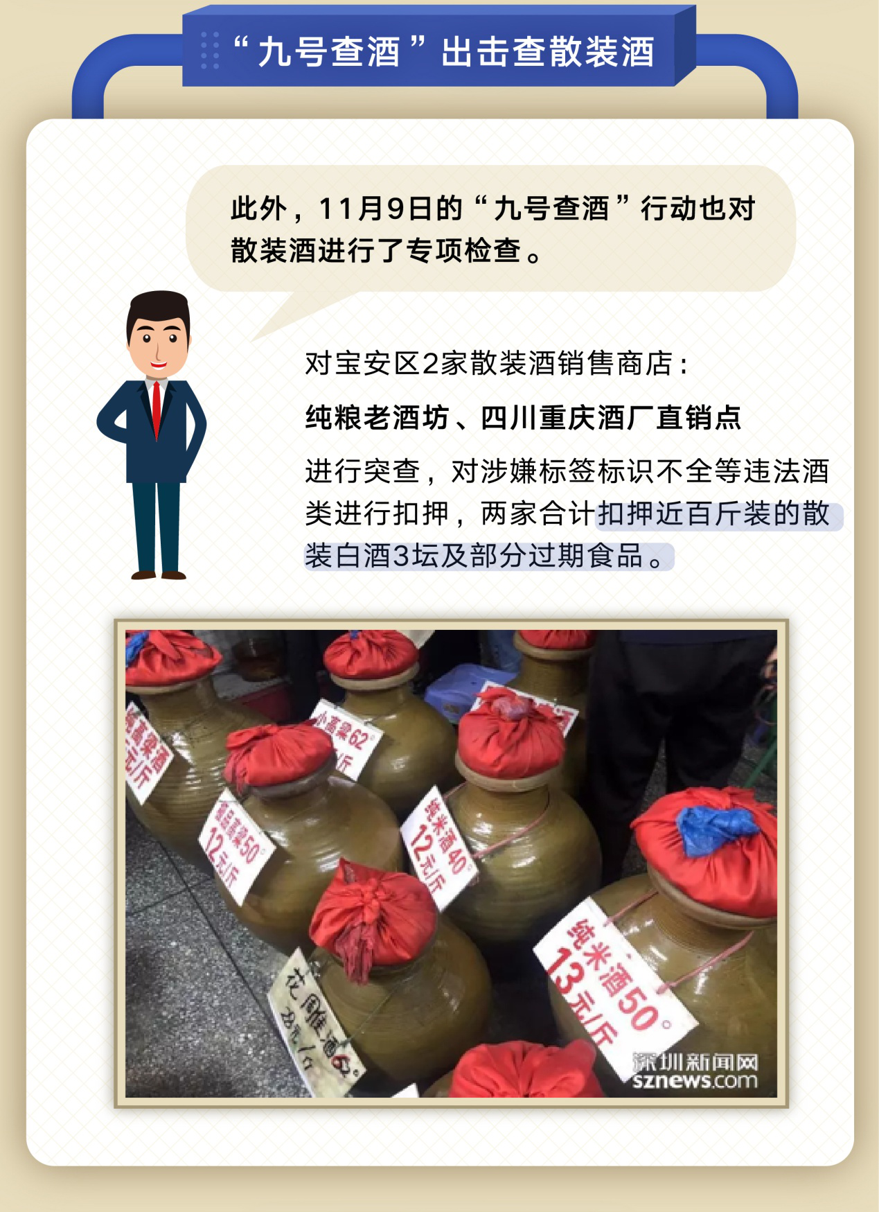 此外,在11月9日的“九號查酒”行動中,也對散裝酒進行了專項檢查,對寶安區(qū)的2家散裝酒銷售商店:純糧老酒坊、四川重慶酒廠直銷點進行了突查,對涉嫌違法酒類進行扣押,兩家合計扣押近百斤裝的散裝白酒3壇及部分過期食品。