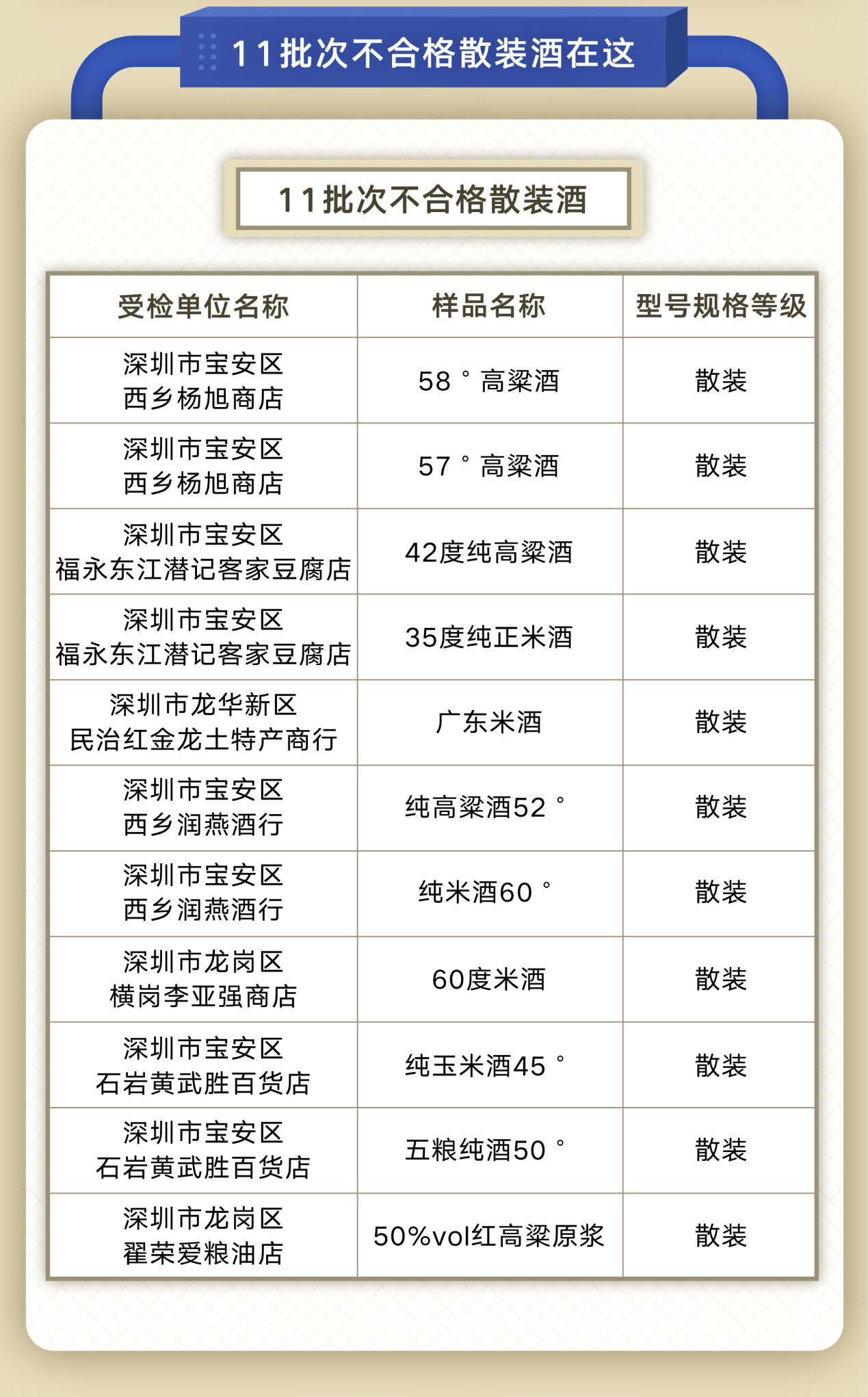 另外,根據(jù)網(wǎng)友點名,抽檢了這些農(nóng)貿(mào)市場的商行散裝酒:寶民市場、寶龍發(fā)農(nóng)貿(mào)綜合市場、南山肉菜市場、水禾田農(nóng)貿(mào)市場、白泥坑村綜合市場、丹竹頭市場、廣北肉菜市場、清湖農(nóng)貿(mào)批發(fā)市場、玉律市場等,全部合格。