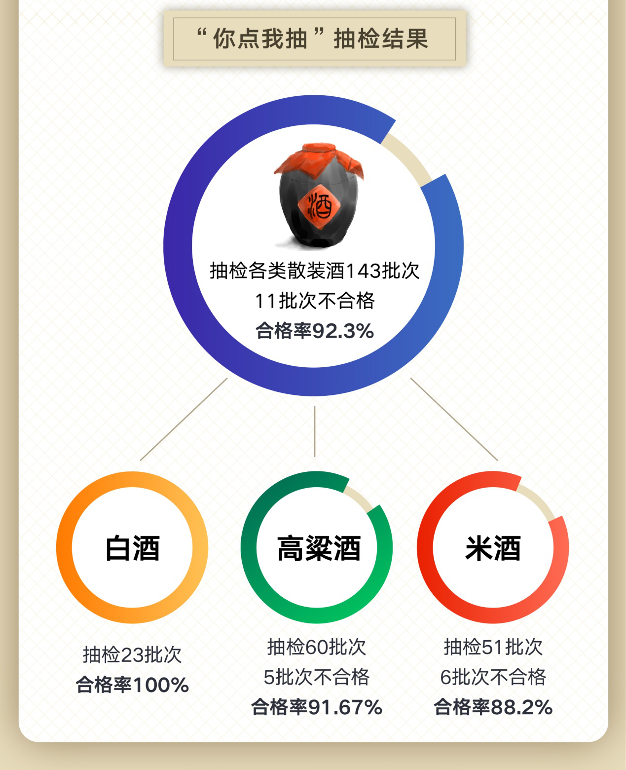 根據(jù)投票結果,此次共抽檢各類散裝酒143批次,11批次不合格,合格率92.3%。其中,抽檢白酒23批次,合格率100%;抽檢高粱酒60批次,5批次不合格,合格率91.67%;抽檢米酒51批次,不合格6批次,合格率88.2%。