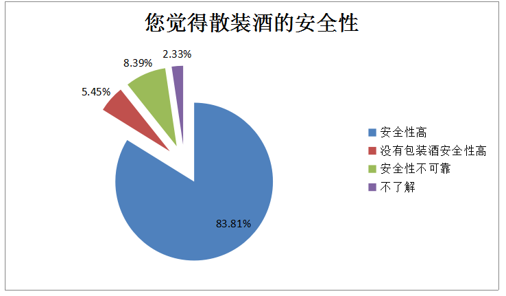 深圳人對散裝酒安全性的評價如何?83.81%的網(wǎng)民還是認為安全性高;只有8.39%的網(wǎng)民和5.45%的網(wǎng)民認為安全性不可靠、沒有包裝酒安全性高。