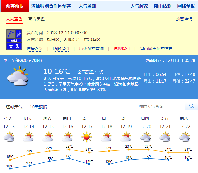 深圳新聞網(wǎng)2018年12月13日訊(記者 施冰冰)記者從深圳市氣象局獲悉,今日天氣寒冷:1多云間陰天,可見陽光,沿海和高地最大陣風6級,氣溫11-17℃,北部及山地最低氣溫略低1℃,白天比12日溫暖;14-16日多云,可見陽光,氣溫逐日回升;寒冷黃色預(yù)警將持續(xù)到今日,14日起氣溫回升。