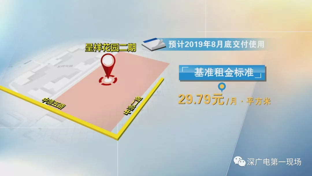 呈祥花園二期位于龍崗區(qū)坂田街道,中浩二路與中浩五路的交接處,預(yù)計2019年8月底交付使用。項目共有5棟住房,基準租金標準暫定為每月每平方米29塊7毛9。