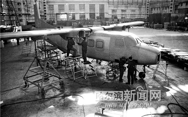 哈爾濱飛機制造公司自行研制的運12多用途民用飛機取得了國內(nèi)首份按國際規(guī)范研制的民用飛機“型號合格證”,圖為當(dāng)年的制造車間。