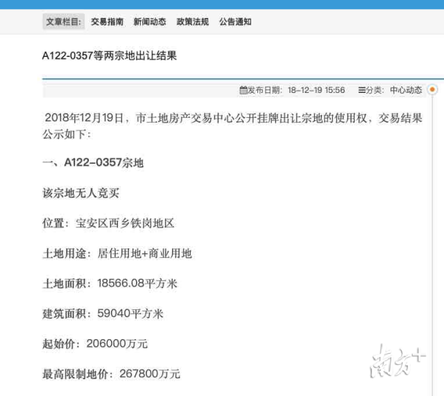記者12月19日查閱深圳市土地房產交易中心官網信息顯示,A122—0357宗地出讓結果為無人競買。