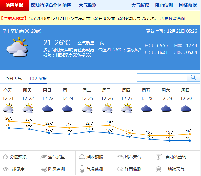 深圳市氣象局預(yù)計(jì),21日深圳市多云間陰天為主,早晚有輕霧或霧,氣溫在20-26℃,東風(fēng)2-3級(jí),相對(duì)濕度65-85%;22日多云間陰天,早晚有輕霧,天氣溫暖空氣濕潤(rùn),氣溫在20-25℃;23-24日受弱冷空氣影響,有分散小雨,氣溫小幅下降;25-26日多云可見陽(yáng)光;27日起受不斷補(bǔ)充的冷空氣影響,氣溫逐日下降,天氣明顯轉(zhuǎn)冷。