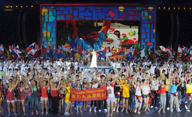 2011年8月23日,第26屆世界大學(xué)生夏季運動會閉幕式在深圳舉行。這是閉幕式上打出的“我們永遠(yuǎn)是朋友”的橫幅。