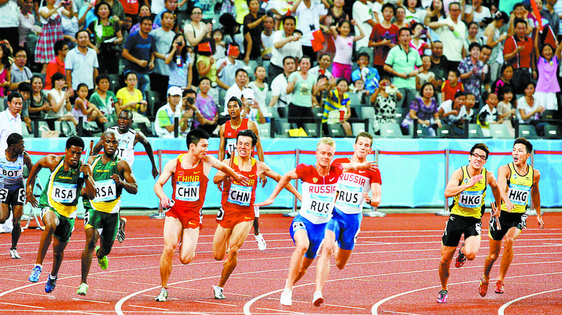 大運會中深圳健兒男子4X100米接力賽上創(chuàng)佳績。鄭東升攝