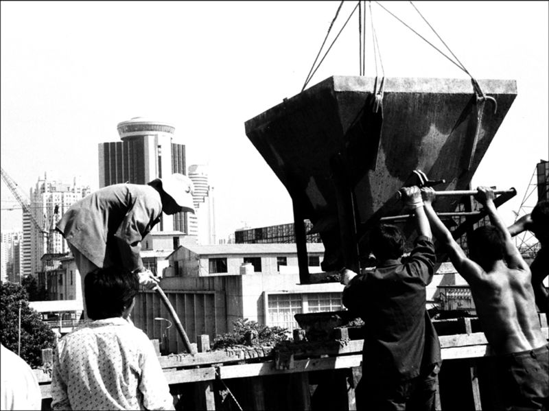 1993年5月,中心區(qū)“四橋一廣場(chǎng)”工程施工進(jìn)入最后沖刺,圖為建設(shè)者們?cè)谶M(jìn)行路面石粉平整施工的情景。馬樹華攝