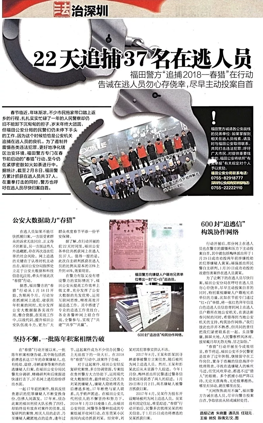 ★★春節(jié)臨近,萬家團(tuán)圓,福田公安分局的民警卻更忙了。他們?yōu)榱硕糁普饝馗黝愡`法犯罪,凈化轄區(qū)治安環(huán)境,專門在春節(jié)前啟動“春獵”行動,劍指負(fù)案在逃的犯罪嫌疑人,行動截止2月8日,警方累計抓獲在逃人員37人。