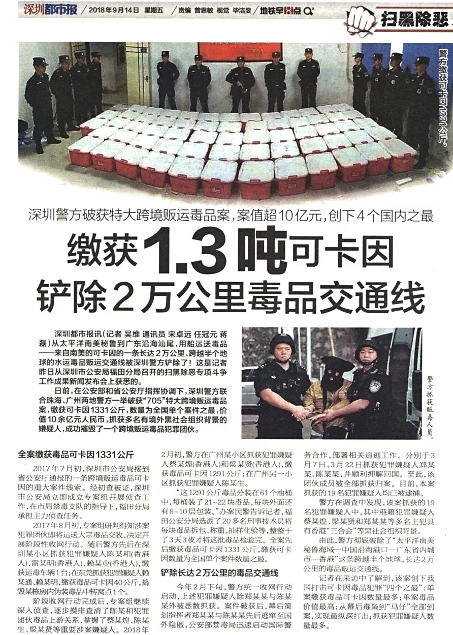 ★★在公安部和省公安廳指揮協(xié)調(diào)下,福田警方作為主力軍,聯(lián)合珠海、廣州兩地警方一舉破獲“705”特大跨境販運(yùn)毒品案,創(chuàng)下我國打擊可卡因毒品犯罪“四個之最”:單案繳獲毒品可卡因數(shù)量最多;單案毒品價值最高;從幕后毒梟到“馬仔”全部到案,實現(xiàn)最縱深打擊;抓獲犯罪嫌疑人數(shù)量最多。