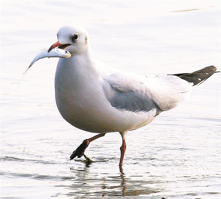 再往東去,便是深圳河入???這里也是深圳河與新洲河的交匯處。在這里,除了5只黑臉琵鷺正在河口覓食,河面上還聚集著上千只紅嘴鷗。每當(dāng)疏浚河道的船只駛過(guò),紅嘴鷗就成群結(jié)隊(duì)地尾隨著船只的航跡,捕食被船槳翻到水面上的魚蝦。
