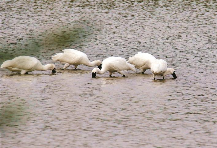 在2號(hào)魚塘里捕食的黑臉琵鷺。