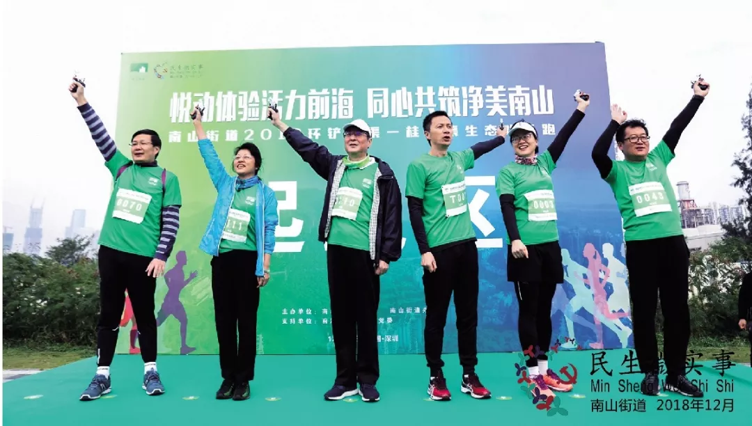2018年12月31日下午3時(shí),南山區(qū)政協(xié)主席陳軍,區(qū)委常委、政法委書(shū)記黃湘岳,區(qū)委常委、區(qū)委(政府)辦公室主任胡蕓,區(qū)人大常委會(huì)副主任、區(qū)總工會(huì)主席路玉萍,區(qū)人大常委會(huì)副主任鄧志榮,南山街道黨工委書(shū)記杜煒平,南山街道辦事處主任黃北球同時(shí)打響發(fā)令槍?zhuān)仙浇值?018環(huán)鏟灣渠-桂廟渠生態(tài)歡樂(lè)跑正式開(kāi)跑,900余名跑步愛(ài)好者從前灣四路鏟灣渠河畔起跑,朝前海石快樂(lè)奔跑。
