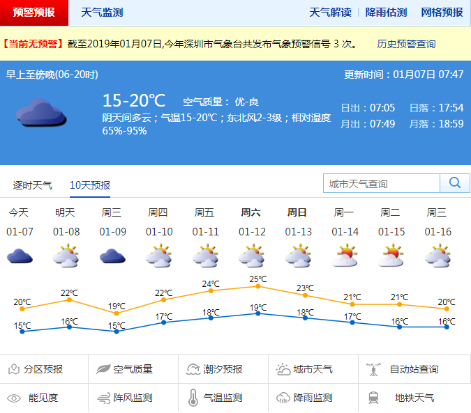 記者從深圳市氣象局了解到,周一到周三受弱冷空氣影響,云量較多,偶有零星小雨,氣溫小幅波動,7日氣溫15-20℃;周四到周六日多云間陰天,可見陽光,氣溫上升,早晚能見度較差;周日受弱冷空氣影響,氣溫略降。