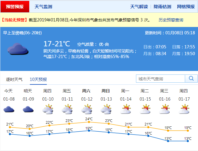 深圳市氣象局預(yù)計(jì),8日陰天間多云,早晚有輕霧,短暫時(shí)間可見陽(yáng)光;氣溫15-20℃;東北風(fēng)3級(jí);相對(duì)濕度65%-85% 。9-10日陰天間多云,偶有零星小雨,短暫時(shí)間可見陽(yáng)光;11-14日多云間陰天,可見陽(yáng)光,天氣溫暖,早晚能見度較差。
