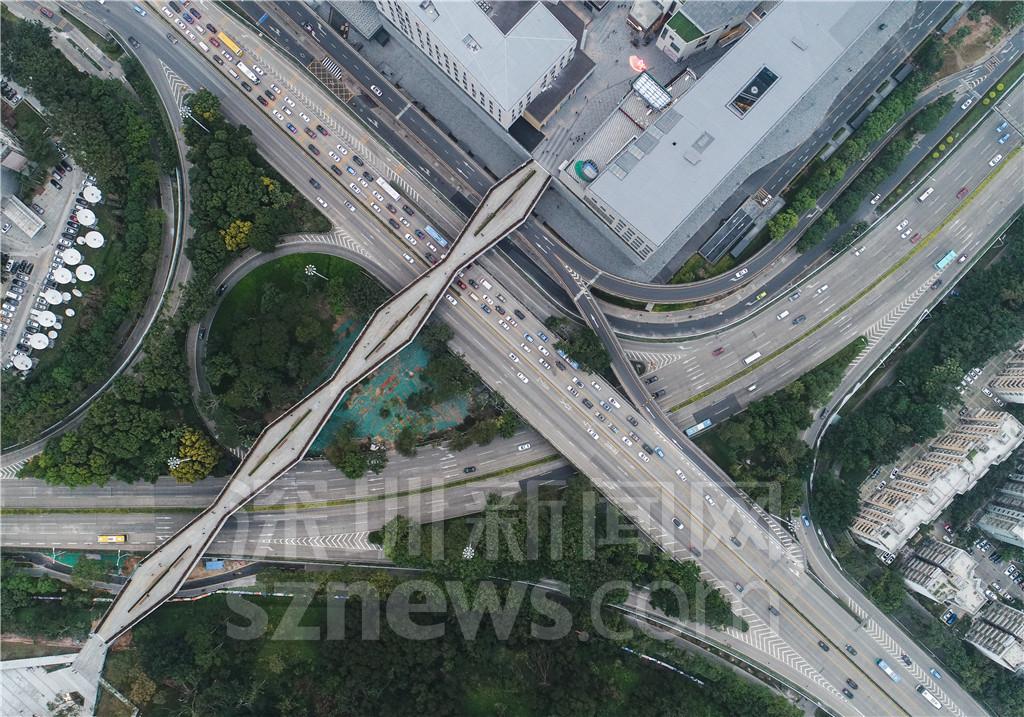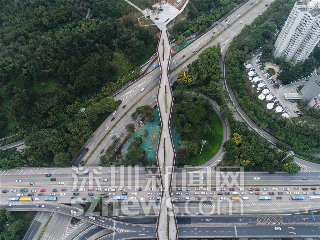 據(jù)悉,蓮花山廊橋由深業(yè)上城規(guī)劃打造,本次開通的300米廊橋路段屬于福田區(qū)的重點景觀提升工程——“蓮花山筆架山空中走廊”。該走廊串聯(lián)兩座綠色公園,跨越彩田路、蓮花路、皇崗路等三條市政道路。全長1.2公里,市民從蓮花山公園步行至筆架山公園只要10分鐘。