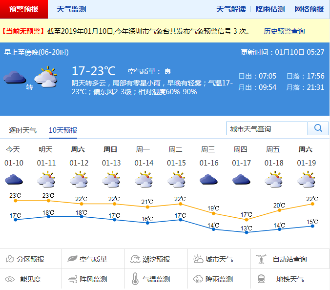 綜合海氣環(huán)流分析和歷史氣候背景,市氣象局預(yù)計深圳的1月將是“氣溫起伏大、階段性陰冷、降雨少而弱”的特點(diǎn)。分別在15-17日、24-25日、1月底至2月初會有冷空氣影響,伴小雨或分散小雨,沿海和高地陣風(fēng)7-8級,且月內(nèi)最低氣溫10℃以下會有三天左右。而在冷空氣間歇期,則受暖濕南風(fēng)影響,空氣濕度加大,易出現(xiàn)霧和輕微回南天。未來幾日多云間陰天,陽光增多,早晚有輕霧,天氣溫暖,早晚較濕潤;15日起冷空氣影響,氣溫小幅下降。
