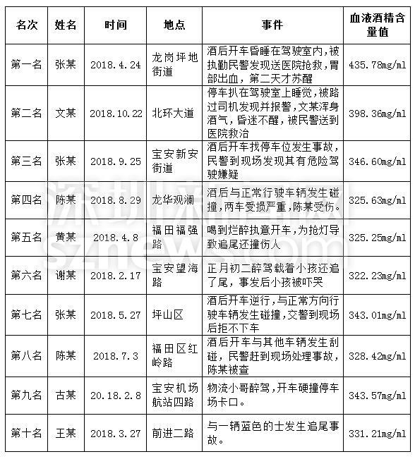 此外,新聞發(fā)布會上還通報了2018年十個查處酒駕的典型案例,其中位列首位的“虎王”張某血液酒精含量高達435.78mg/100ml,是危險駕駛標準的5倍多,也是2018年血檢數(shù)值最高的醉駕嫌疑人。