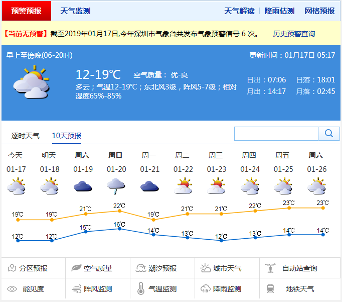 深圳新聞網(wǎng)2019年1月17日訊(記者 劉婷)受冷空氣和切變線影響,深圳1月16日陰天有小雨,天氣明顯轉(zhuǎn)涼。今日白天,陰天轉(zhuǎn)多云可見(jiàn)陽(yáng)光。早晚最低氣溫徘徊在12 ℃左右,中午前后最高氣溫在19 ℃左右,早晚較冷,注意添衣保暖。