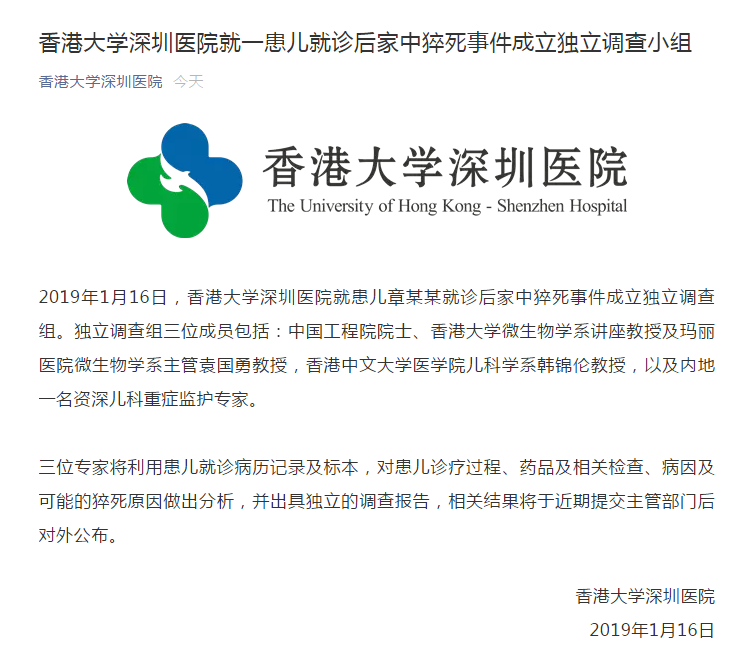 1月16日,香港大學深圳醫(yī)院就患兒章某某就診后家中猝死事件成立獨立調(diào)查組,待調(diào)查完畢后將把相關(guān)結(jié)果提交主管部門并對外公布。