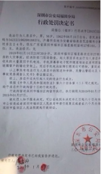 1月14日21時30分,福田區(qū)福田村崗邊坊27棟1樓發(fā)生火災事故,因處置及時,事故未造成人員傷亡和財產(chǎn)損失。經(jīng)消防部門現(xiàn)場勘查認定:火災是由于違法行為人房某將回收的廢棄電池、手機屏等電子配件隨意堆放在靠窗貨架上,電池故障引燃周圍物品導致。福田派出所依法對房某處以行政拘留十天。