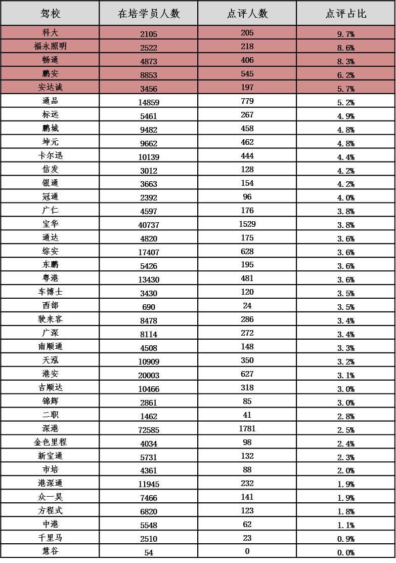以下對深圳各駕校詳細(xì)信息進(jìn)行公布,市民可根據(jù)下表,選擇人車比和在培待考量相對較低、學(xué)車周期較短、投訴率較低、誠信評價(jià)等級較高的駕校進(jìn)行培訓(xùn):