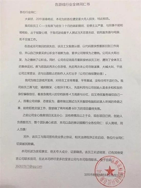 1月20日,深圳市螃蟹網(wǎng)絡(luò)科技有限公司創(chuàng)始人尹柏霖發(fā)文控訴,前員工燕某在游戲上線測試當(dāng)天(2017年12月15日),鎖死服務(wù)器與電腦,并惡意失蹤,致公司損失慘重。尹柏霖稱,“我們上線不了也測試不了,等新員工到職后熟悉新代碼又是幾個(gè)月過去了。”