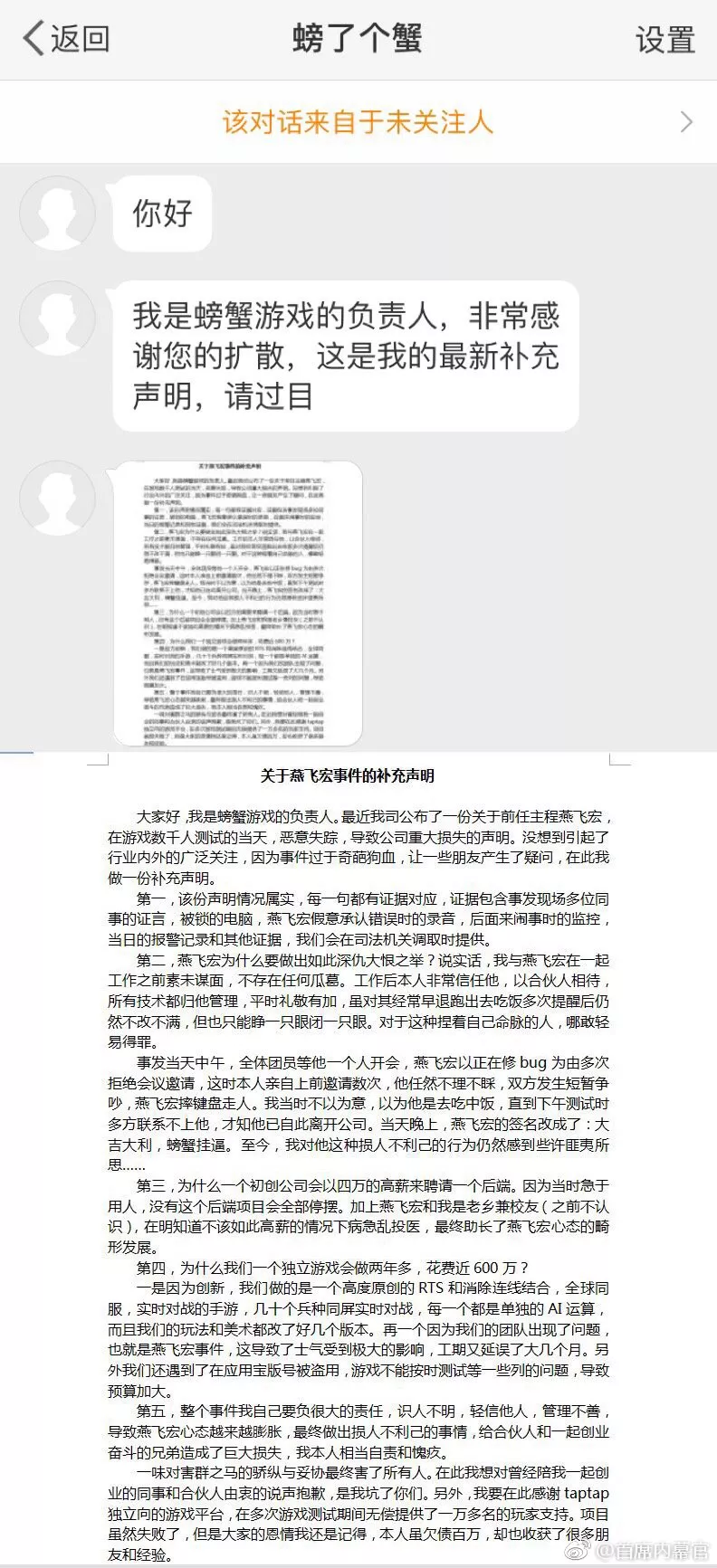 隨后,一位自稱是燕飛宏前同事的網(wǎng)友發(fā)文稱:之前的公司讓他做很簡單的游戲,但是他三四個月連框架都沒寫出來,業(yè)務(wù)能力只會用老套代碼,不愿意跟同事溝通,工作很不負(fù)責(zé)任、易暴躁、打人。