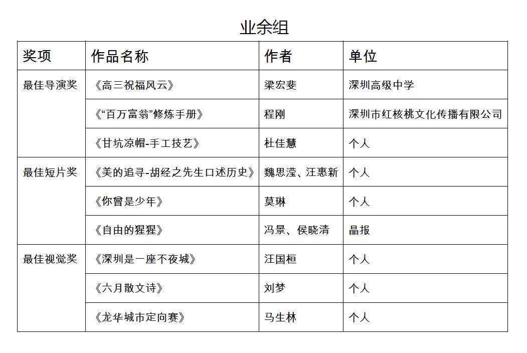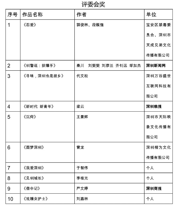 作為創(chuàng)意12月活動的重頭項目,本次視頻大賽由深圳報業(yè)集團、深圳市網(wǎng)絡媒體協(xié)會主辦,深圳新聞網(wǎng)、深圳市中影南方廣告有限公司、深圳市上御同禧文化傳播有限公司承辦,面向社會共征集到視頻作品500余部。大賽組委會邀請了專業(yè)媒體人士和影視大咖擔任評委,共有70件作品入圍終評會,經過組委會辦公室的最終評選,最終確定了獲獎作品。參加比賽的,既有新聞媒體界和廣告公司的專業(yè)人士,也有各行各業(yè)熱愛視頻拍攝制作的“發(fā)燒友”,參賽作品題材廣泛,既有記錄深圳城市風貌的視覺大片,也不乏故事性強、拍攝剪輯手法新穎、主題立意深刻的作品。