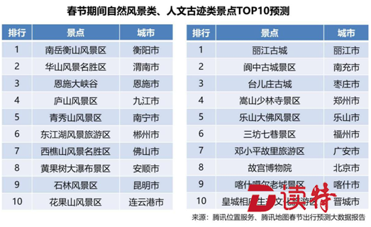 除了返鄉(xiāng)外,春節(jié)同樣是外出旅游的好時(shí)機(jī)。據(jù)《報(bào)告》預(yù)測(cè),在全國(guó)259家5A級(jí)旅游景點(diǎn)中,南岳衡山風(fēng)景區(qū)、華山風(fēng)景名勝區(qū)、恩施大峽谷將排名最火爆自然風(fēng)景類(lèi)景區(qū)前三,麗江古城、閬中古城景區(qū)、臺(tái)兒莊古城則是最具人氣的人文古跡類(lèi)景區(qū)前三。