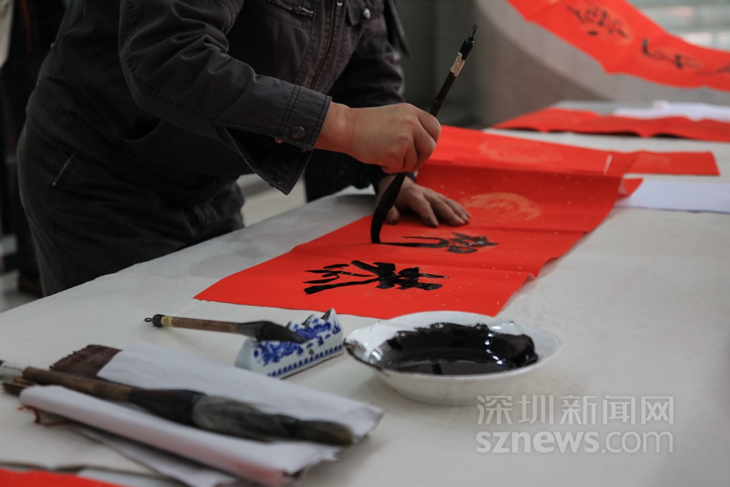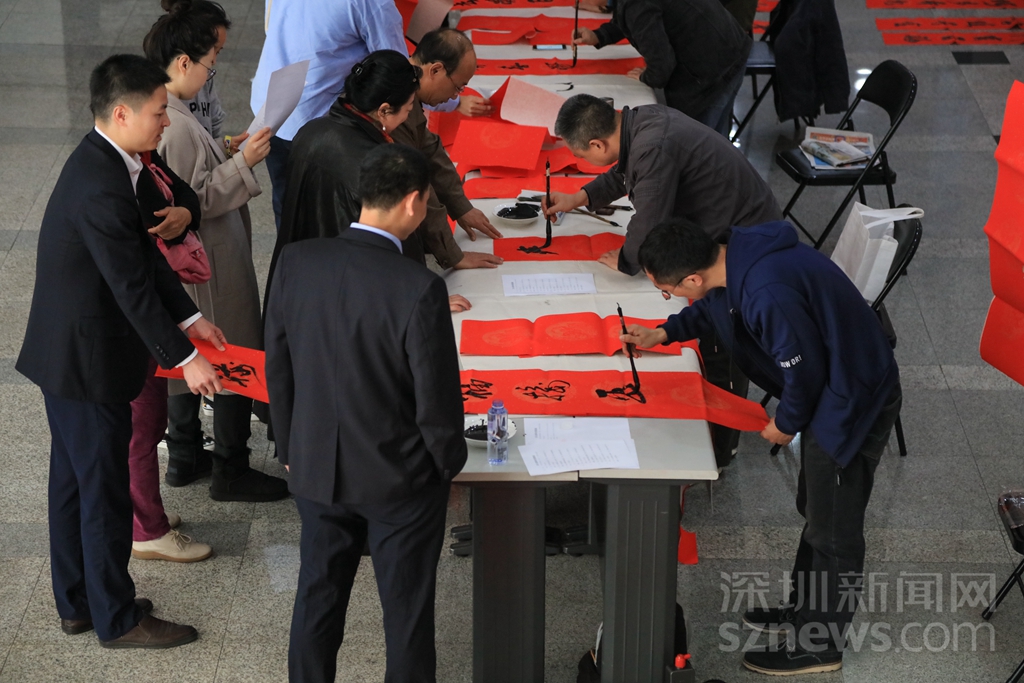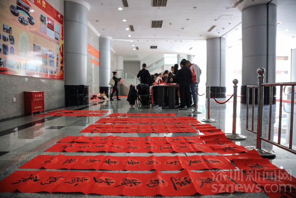 過年貼春聯(lián),是中華民族的傳統(tǒng)習(xí)俗之一??梢哉f,春聯(lián)一出,年味十足。記者在深圳商報大廈一樓活動現(xiàn)場看到,工作人員早已準(zhǔn)備好了春聯(lián)的紅紙和筆墨,多位書法了得的記者編輯揮毫潑墨,創(chuàng)作出了一幅幅寓意喜慶吉祥的對聯(lián),并免費(fèi)贈送給同事。不少人為了能拿到新鮮出爐的春聯(lián),提前在現(xiàn)場排隊等候。