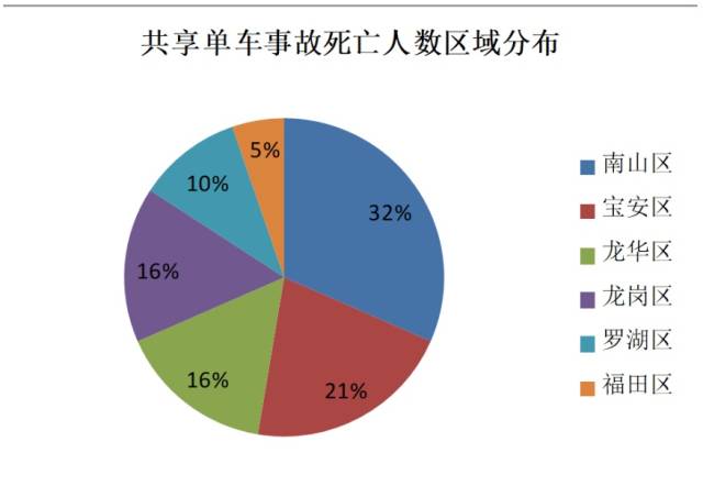 從事故行政區(qū)分布來(lái)看,南山區(qū)發(fā)生的共享單車事故死亡人數(shù)最多,死亡6人、占比約為32%,其次為寶安區(qū)、死亡4人、占比21%。