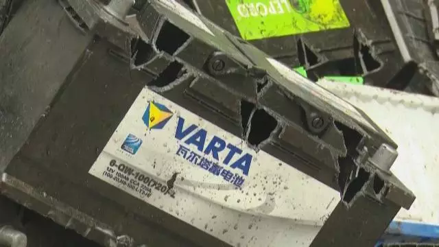 1月16日下午,記者跟隨南山區(qū)環(huán)保水務執(zhí)法人員,到現(xiàn)場查處,一處近500平米廢品回收場站內(nèi),廢舊電池堆積如山,之前3名工人拿著類似砍刀的工具,用簡單粗爆方法,對電池進行拆解。