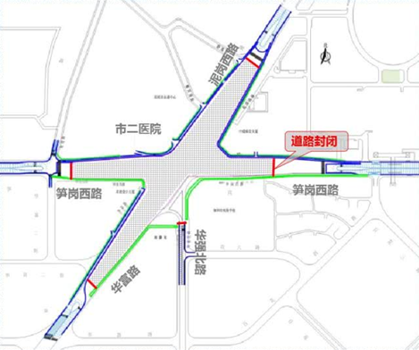 4.為確保市民就醫(yī)便利,黃木崗立交靠市二醫(yī)院一側(cè)新增一條疏解路、合計共三條右轉(zhuǎn)輔道,其中的兩條車道專供市二醫(yī)院車輛使用。