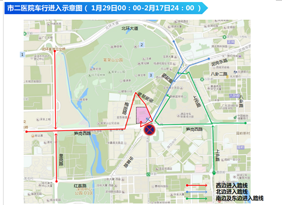 市二醫(yī)院車行進入示意圖--紅色線條為西邊進入醫(yī)院道路,藍(lán)色線條為北邊進入醫(yī)院道路,綠色線條為南邊及東邊進入路線。